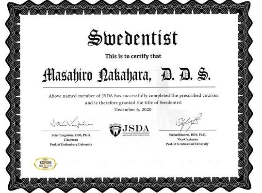 この度、当院理事長の中原がJSDA(日本スウェーデン歯科学会)の理事に就任しました。また、合わせて主催するスタディコース(Dental Education Program)を受講し、無事認定も受けました。