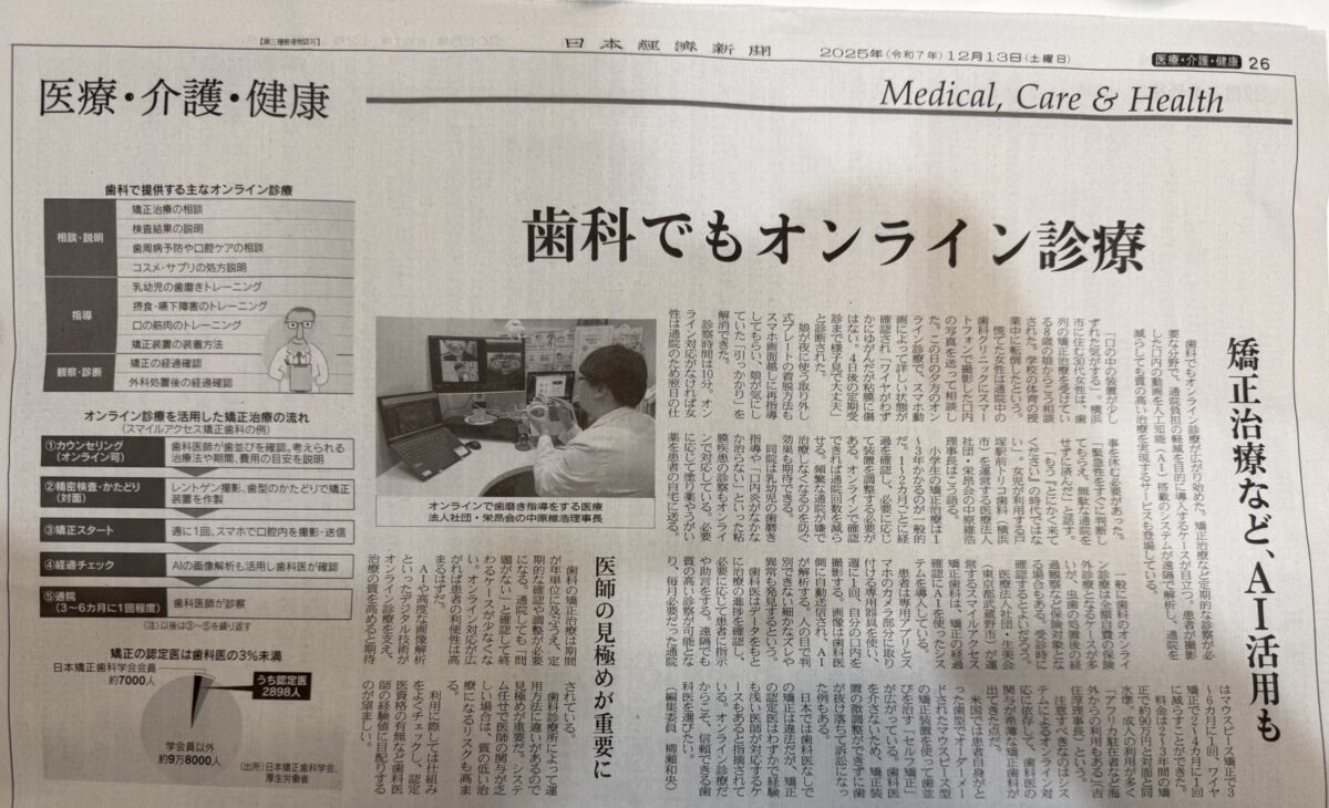 先日(12月13日)発行された、日本経済新聞の医療・介護・健康面にて、当法人の理事長 中原維浩が「歯科のオンライン診療」について取材を受け、その記事が掲載されました。