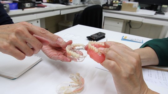 【1】印象採得(型取り)時、【2】試適(入れ歯の仮合わせ)時、【3】ファイナル義歯(完成した入れ歯)装着時、の3回、歯科技工士が医院に立ち会います。患者さんが歯科技工士と直接コミュニケーションが取れるので、装着時の「痛み」や「違和感」をリアルタイムで伝えられる点が大きなメリットです。