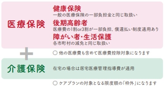 当院の訪問歯科診療ですが、基本は「保険診療」となります。下記の図にある通り、訪問歯科診療費は、「医療保険」と「介護保険」を算定いたします。