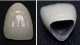 内面が歯科合金で、外面にはセラミックとプラスチックを混ぜたハイブリッド(グラディア・エステニア・ツイニー)を焼き付けています。他のレジン(歯科用のプラスチック)に比べ、グラディアという素材は高い強度と粘り強さを持ってます。レジンにセラミックの粉末を混ぜたものなので、セラミックとは別物になります。インプラントの被せ物に向いています。